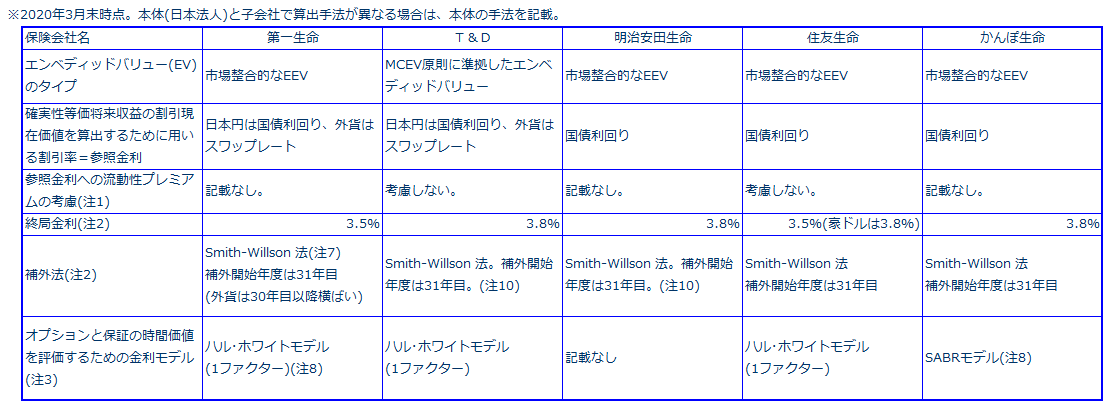 日本の生命保険会社が、どのようにエンベディッドバリューを算出しているかを表にまとめた(ソースは各社のWebサイト)。大手の一角、日本生命はエンベディッドバリューを開示していない(もちろん日本では法定開示の対象ではないので、各社とも参考開示)。