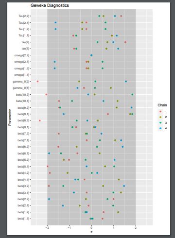 得られた標本系列の前半(通常は、10%)と後半(通常は、50%)で、マルコフ連鎖を成すパラメータθの関数g(θ)の期待値が同じかどうかを仮説検定する。